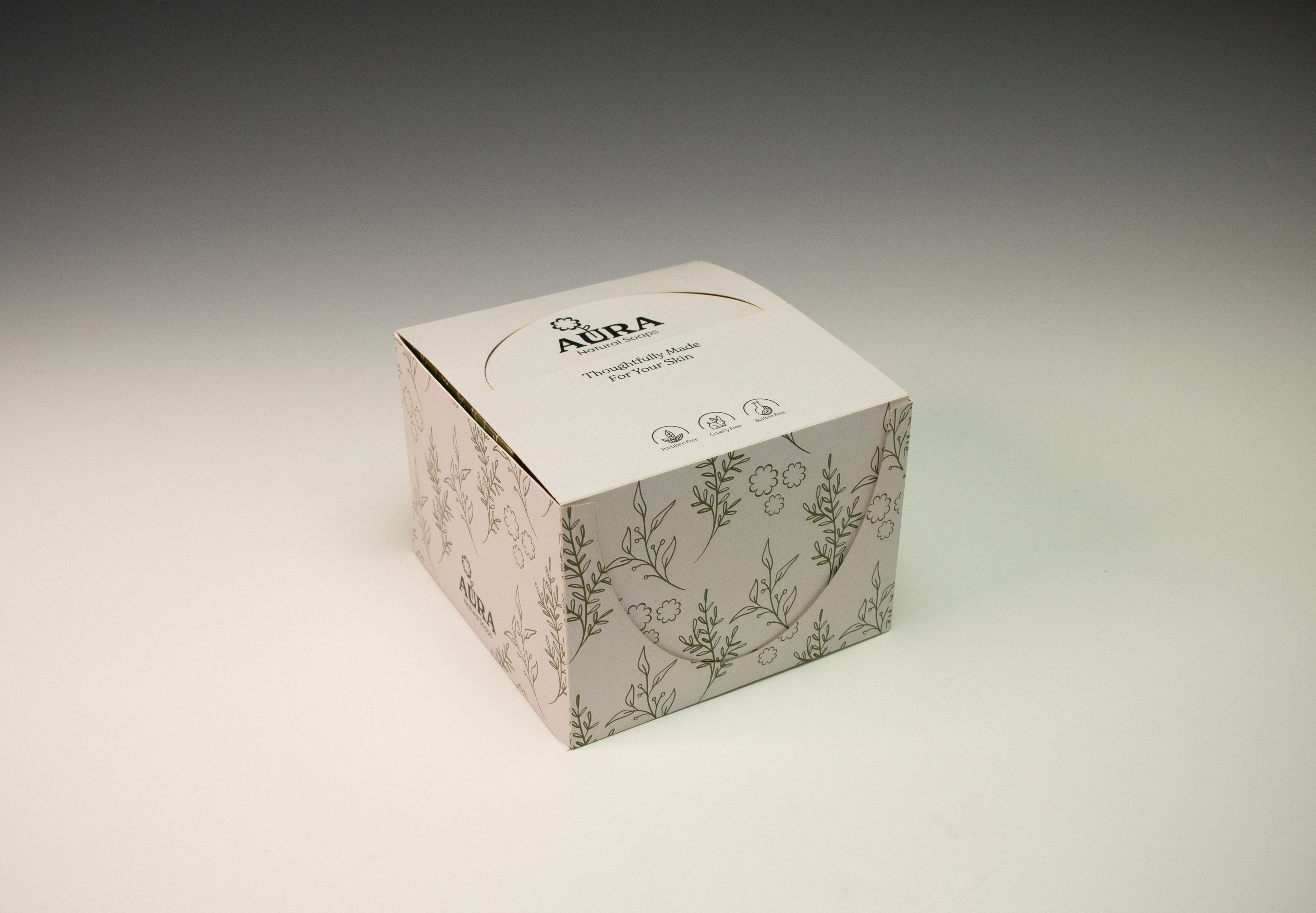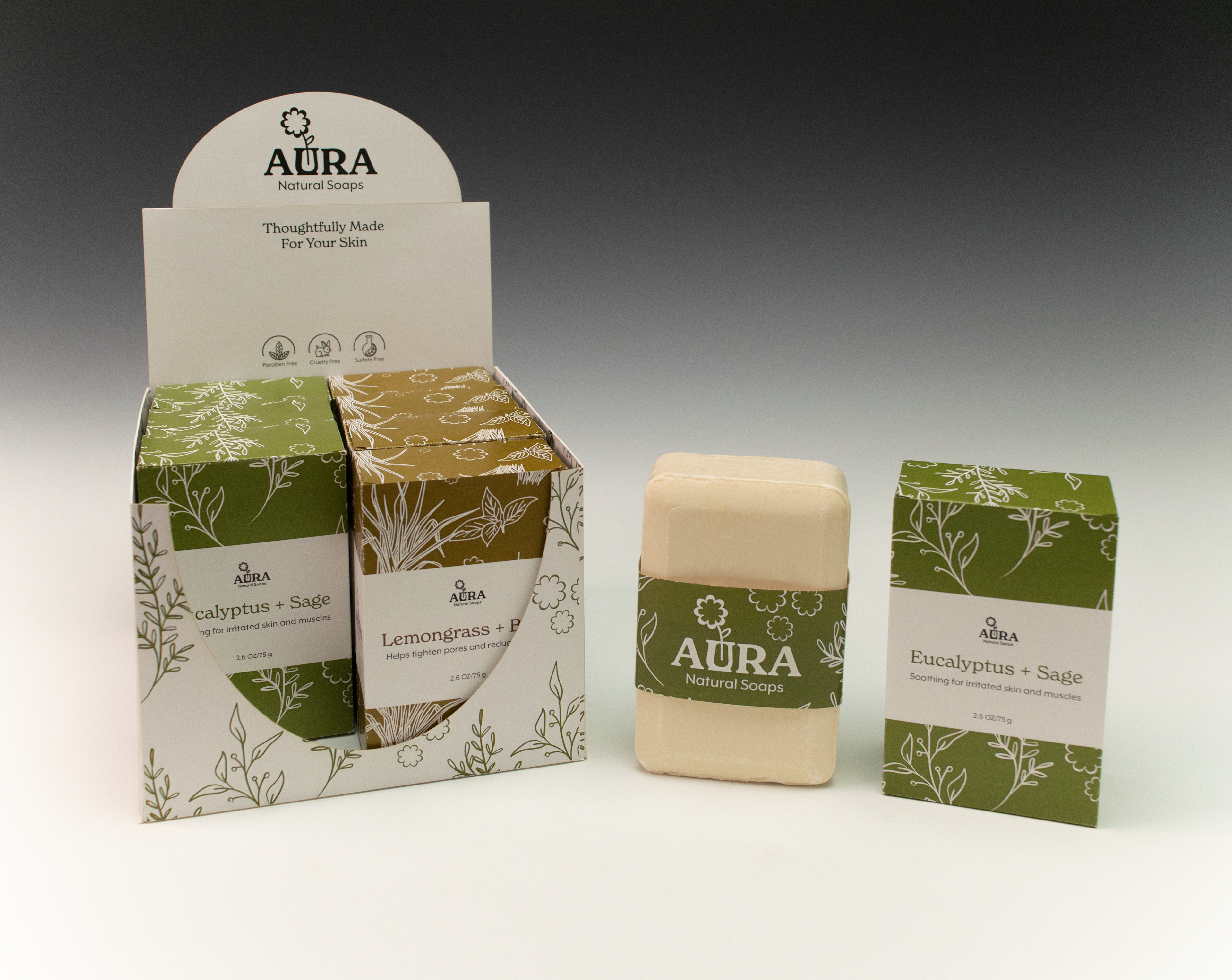 Packaging for a tuck-box and Point of Purchase display for the soap brand Aura.