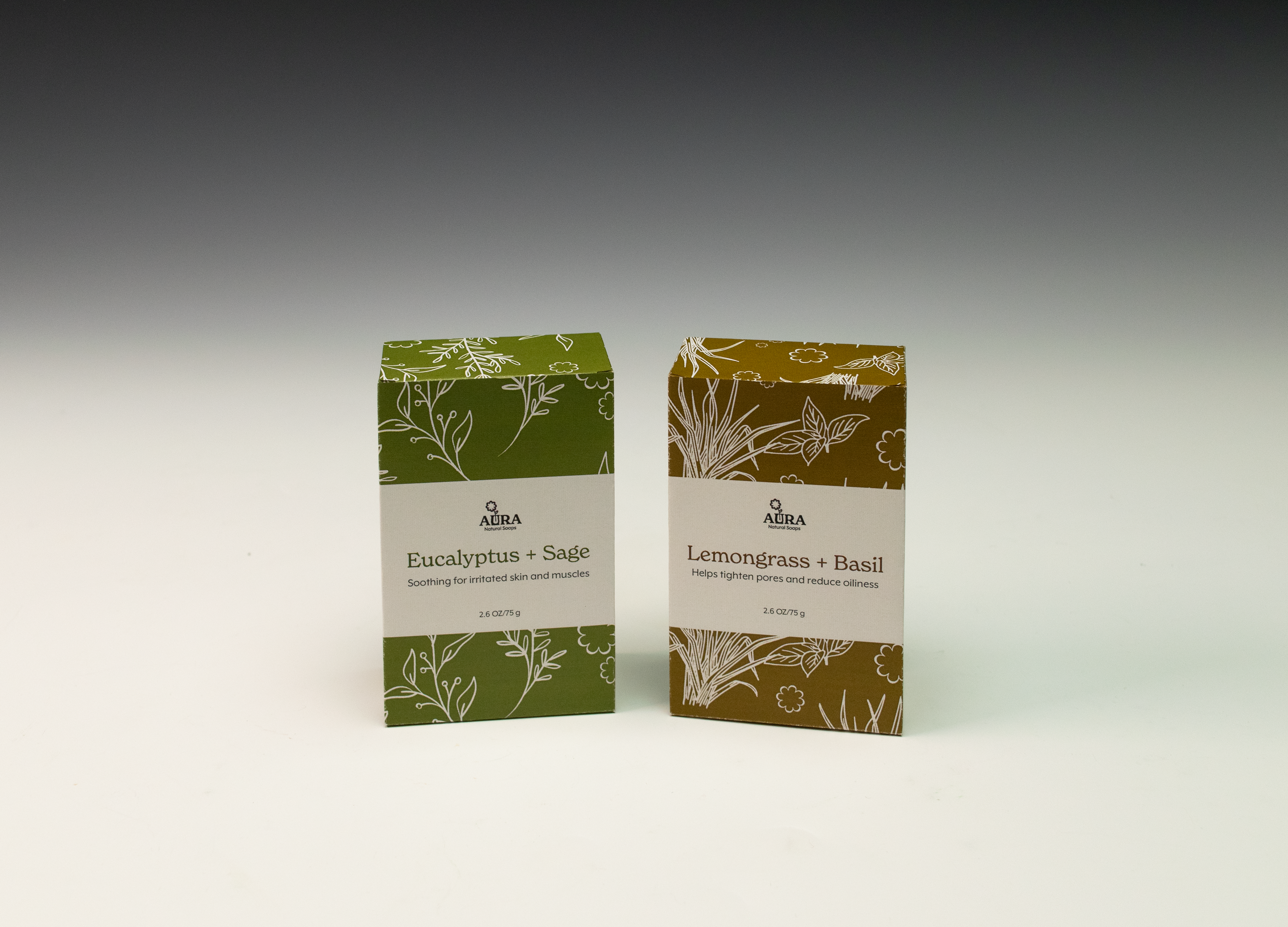 Aura's brand identity is natural, clean, and friendly. This is evoked in the earthy color palette and friendly typeface choices. The audience for Aura is adults who are interested in clean beauty and sustainable products. Aura would be sold in farmers' markets and natural food stores. The packaging is clean and simple, making the brand seem reliable and safe. The pattern is delicate and informs the reader about the product's aromatic fragrances. The logo is approachable and reflects the natural aspect of the brand.
