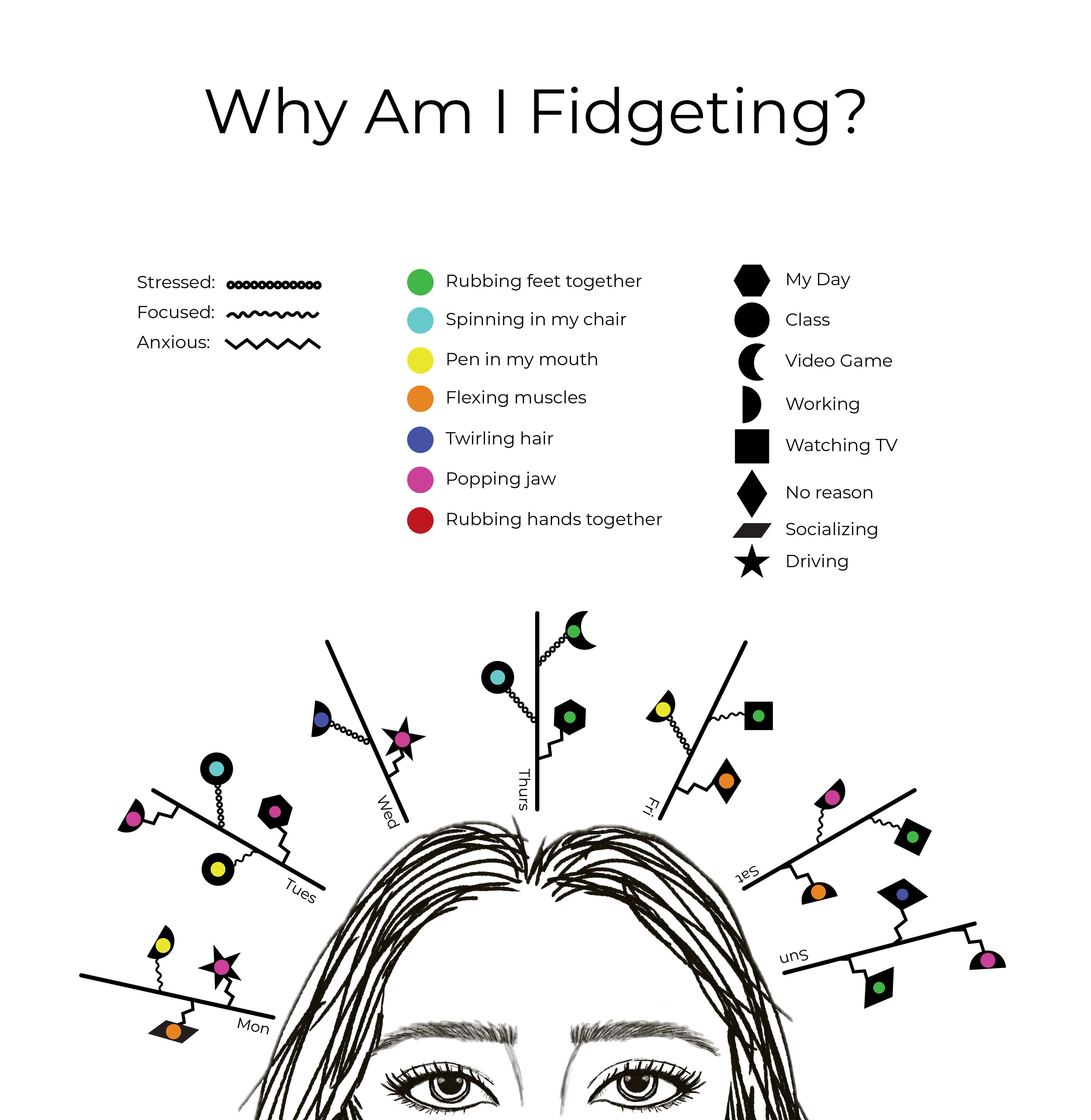 For the last week, I focused on my fidgeting habits. I tracked what I was doing, like twirling my hair, rubbing my hands together, or spinning in my chair. I tracked how I was feeling and in what setting these things were happening. To connect the data on a personal level, I sketched the top of my head as a reminder that these fidgets come from my own thoughts and feelings.