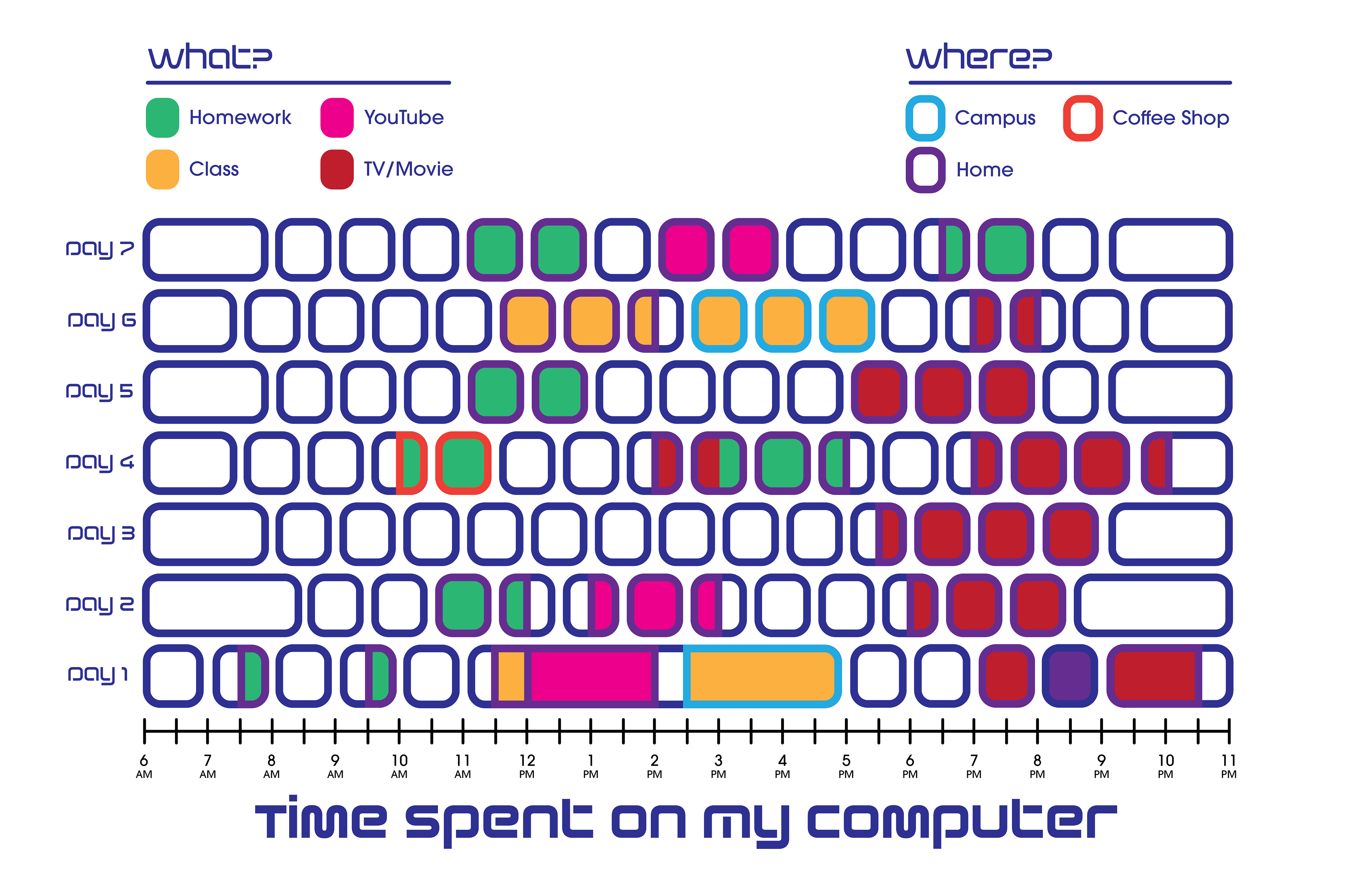 For the first week, I logged every hour I spent on my computer and broke it down into categories like homework, class, YouTube, or TV. I also kept track of where I was and what time of day. My design was based on a computer keyboard.
