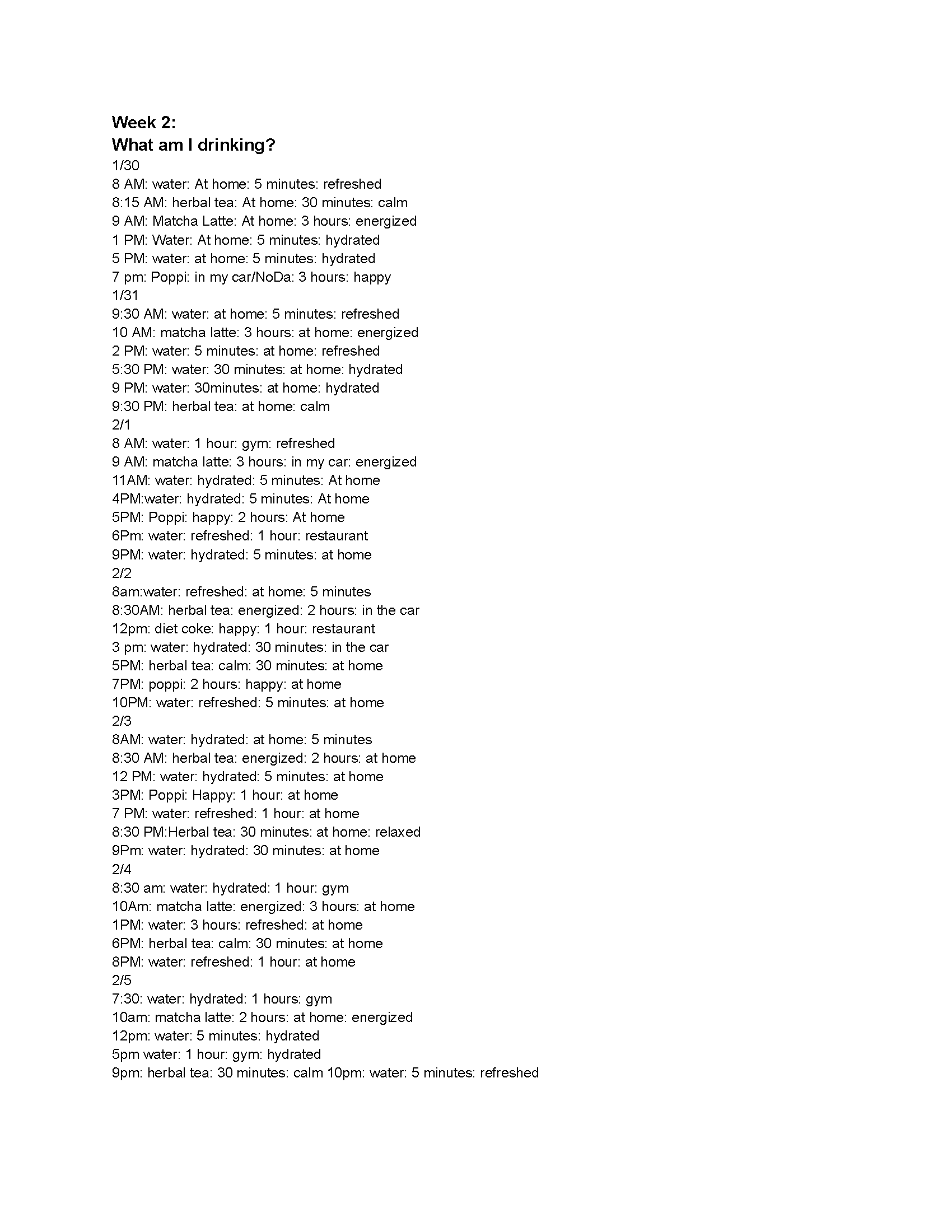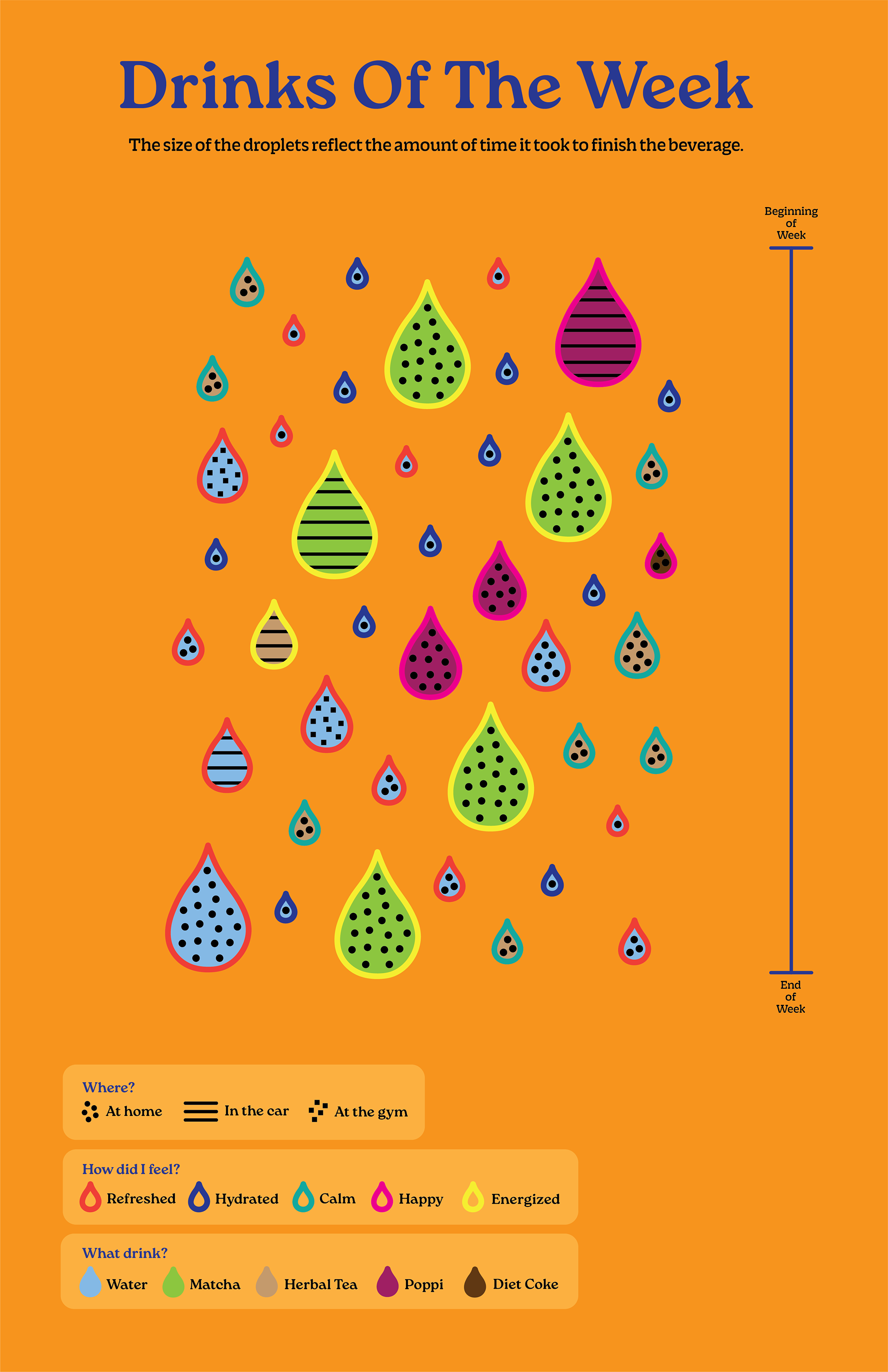 The second week, I logged what I was drinking. I turned each beverage into a droplet, changing its size to match how long it took me to finish each drink, its color to show what the drink was, and its pattern to capture where I drank it. I also added how I felt. This design is bolder and brighter to reflect the light-hearted topic that I chose.