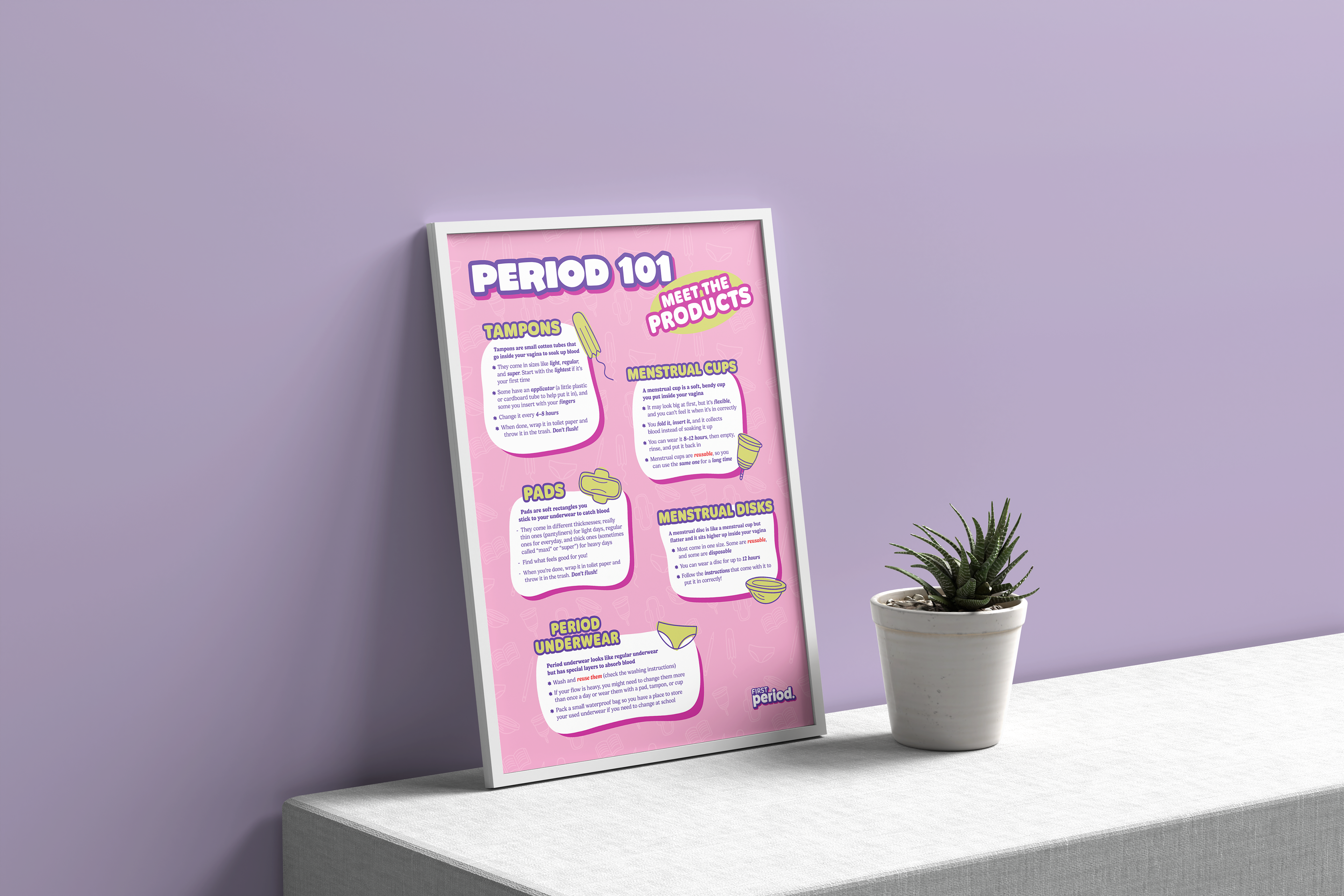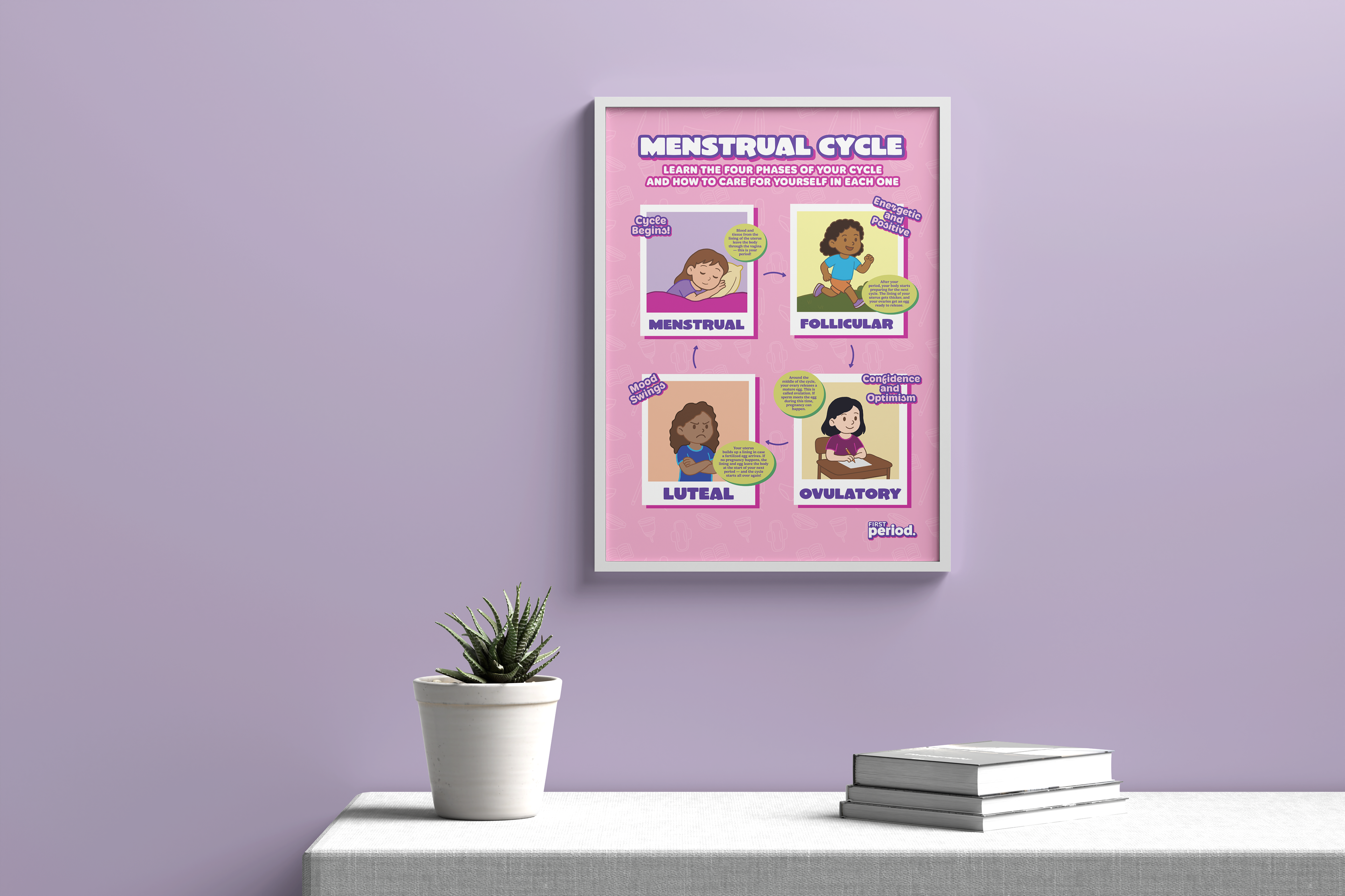My first product is a poster series designed to educate girls when they have questions about menstrual products and their cycle. Girls are often embarrassed and scared to ask questions to their teachers or coaches about their period. According to Thinx, only 30% of teens claim their school actively supports students during their period. That is why these posters will be beneficial in school bathrooms for girls to use as a resource.