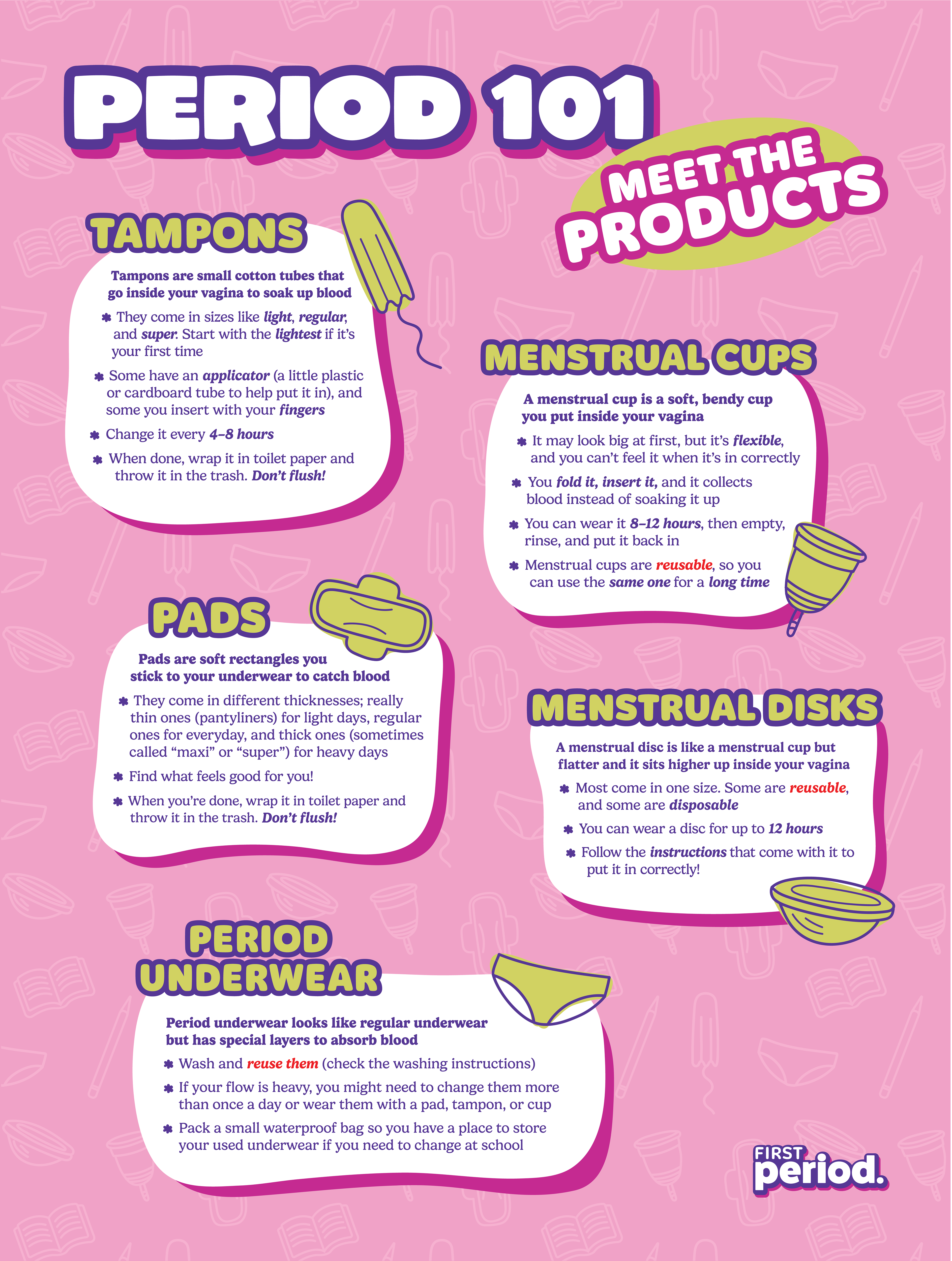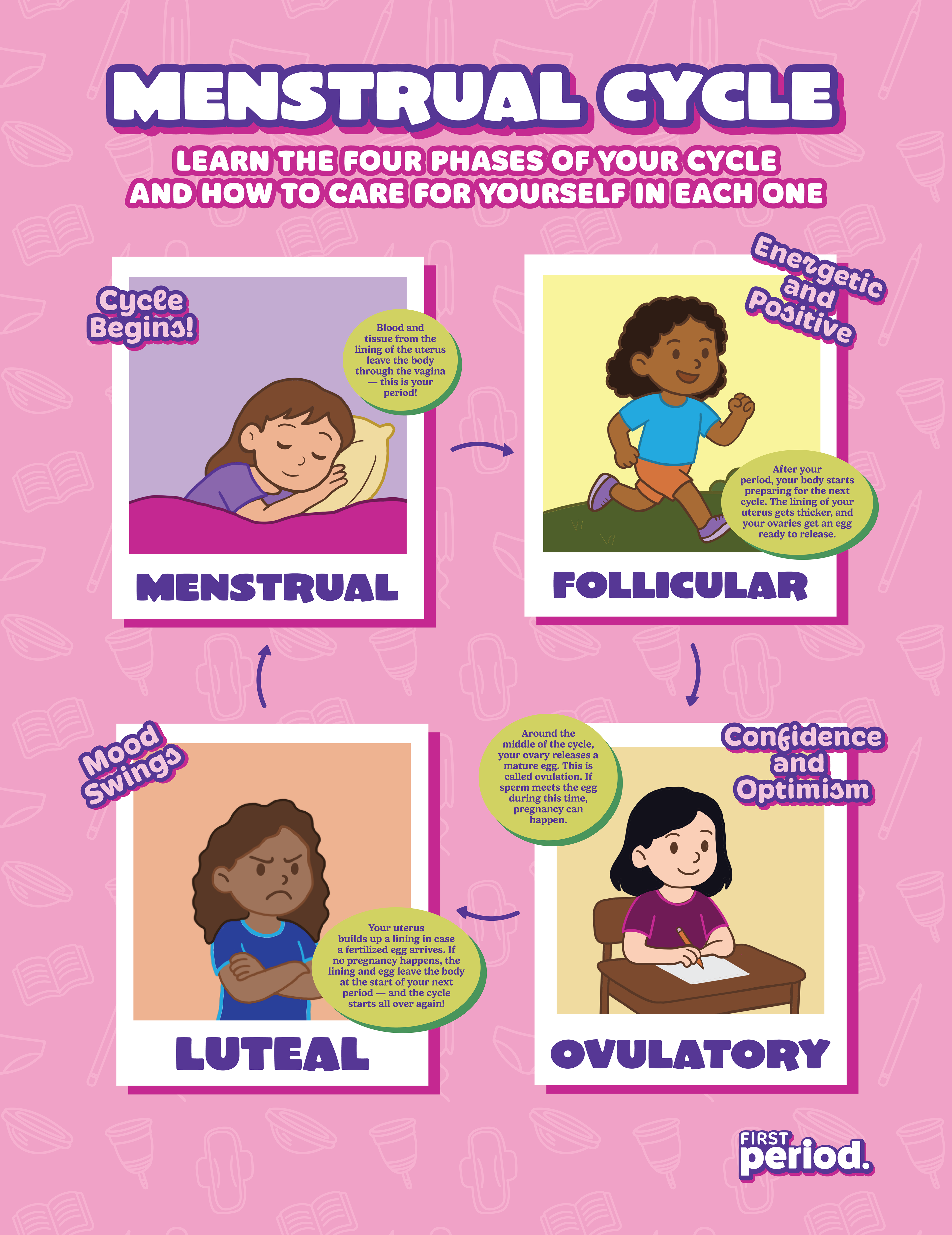 The color palette is bold, fun, and feminine to appeal to young girls. The logo keeps a playful and inviting tone by using sans-serif and low contrast typefaces and the pink and purple colors are confident and encouraging rather than clinical or medical. I designed the pattern with icons of menstrual products and school supplies to connect education and menstruation. The pattern is simple so that it doesn't distract from the important information on my products.