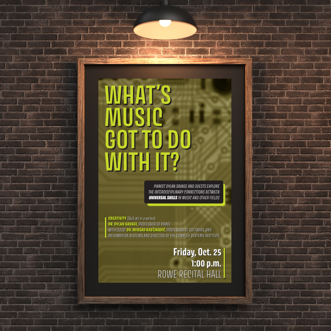 For the second performance, the field of study is software and information systems. To connect the poster to technology, I used an image of a motherboard and blurred and recolored it to connect with the new color scheme. I kept the consistency of the type and layout from the first poster.