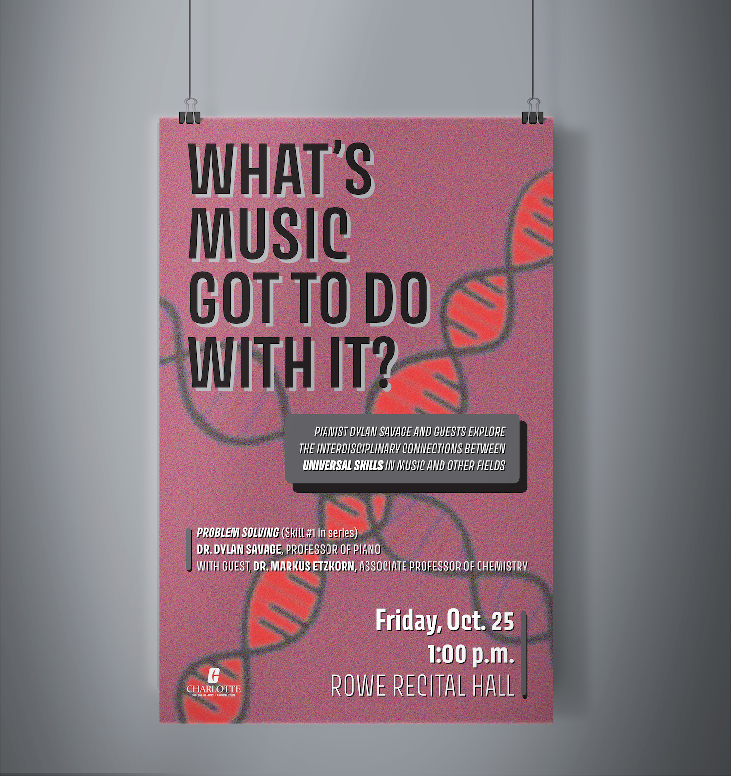 The first performance of the series combines music and chemistry. My concept was to intertwine DNA strands and piano keys into a bold background image. After experimenting with textures and colors, I decided that a monochromatic grunge aesthetic was the direction I wanted to move forward with. Exploring interdisciplinary connections is out of the norm and rejects conformity, so a grunge style felt applicable. The all-caps, bold sans-serif typeface is commanding and instantly draws the viewer’s attention. Using various elements, such as lines and boxes, the information is presented in a digestible way.